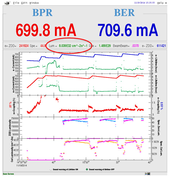 BEPCII调束和运行人员在新一轮的机器研究中,不断创造了对撞亮度的新高。11月18日,BEPCII在设计能量(1.89GeV)下,620mA双束对撞,亮度达到7.15×1032cm-2s-1!超越了7.08×1032cm-2s-1的原纪录。11月19日,对撞亮度再次突破,超越8.0×1032cm-2s-1,达到了8.04×1032cm-2s-1。目前BEPCII运行与调束人员正在继续努力,克服各种困难,逐步提高流强,争取获得更高亮度纪录。