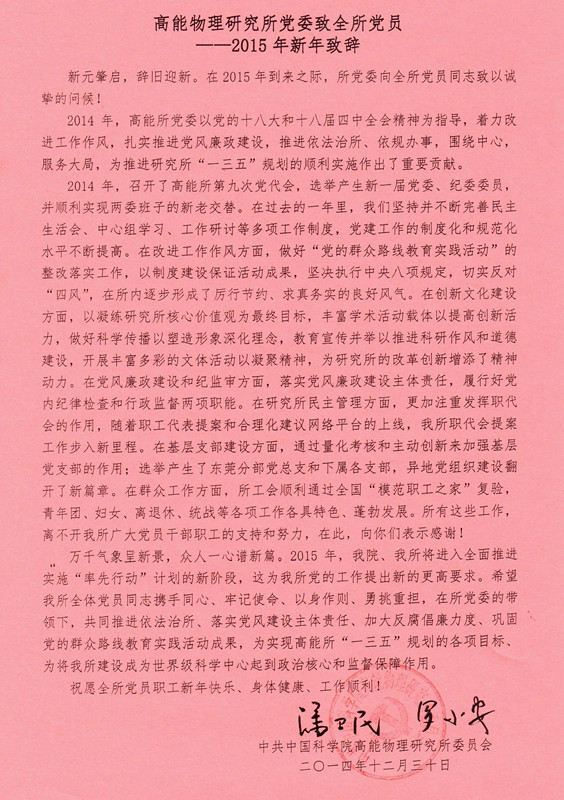 高能物理研究所党委致全体党员——2015年新年致辞