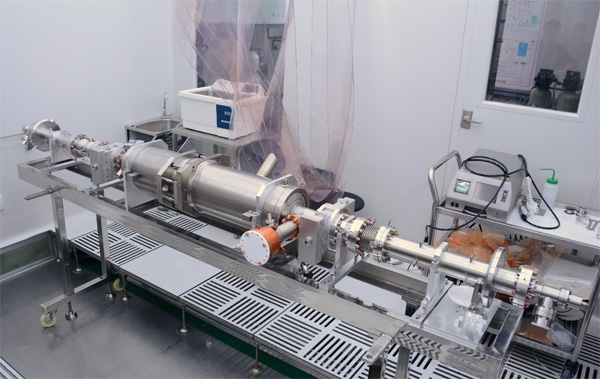 组装完成的9-cell腔束线长3.5 m,由我所自主研制的1.3 GHz大晶粒铌、低损耗型9-cell超导腔及液氦槽、1.3 GHz双窗高功率输入耦合器冷端和束流管道等组成,其中9-cell腔垂直测试加速梯度20 MV/m,品质因数Q0 = 1.4×1010,无场致发射,高功率输入耦合器老练测试通过行波脉冲功率1MW。