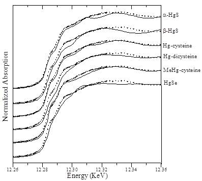 2  米糠和标样中汞的LIIIXANES谱对比(实线为标样XANES谱,虚线为米糠XANES谱)