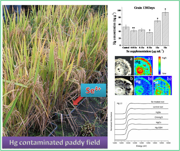 据报道,我国仅贵州清镇地区受汞污染的农田就有360公顷。水稻是当地居民重要的粮食作物,种植在汞污染农田中的水稻不可避免的受到汞污染,造成稻米中汞含量超标,给当地居民带来了健康风险。根据汞的特性,汞污染土壤可采取客土法、热脱附法、化学淋洗法、固化法及植物修复等方法进行修复,但这些方法或者需要大量资金、或者需要漫长时间,而且还需要改变农田用途。结合当地农田稀少的特点,科研人员提出了不改变农田用途,利用硒降低稻米中汞含量,从而降低食用大米带来的健康风险的新思路。硒是人体必需的一种微量元素,对维系机体生命活动具有重要的意义。该研究利用清镇当地农田开展了为期一年的水稻补硒实验。结果发现,补硒不仅可以提高稻米的产量,而且可以降低水稻各地上组织,特别是米粒中汞含量。研究人员还进一步利用同步辐射技术等手段,对硒降低稻米中的汞含量的机理进行了探讨,认为硒的加入降低了土壤中汞的生物可利用度、促进了根表铁膜及其他生物屏障的形成并在米粒中形成了无毒的汞硒复合物。