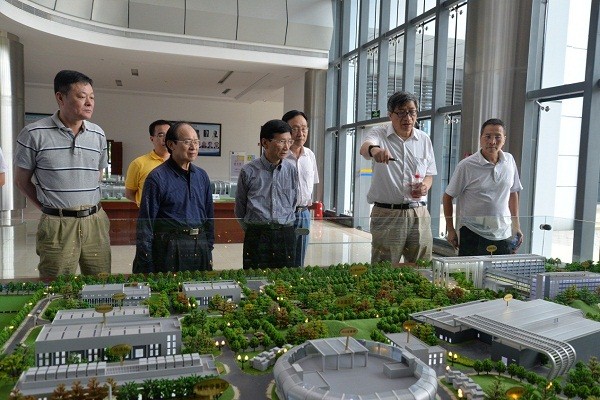 钟阳胜一行观看了CSNS沙盘模型,陈和生介绍了东莞分部的园区布局和装置原理,并对广东省和东莞市给予的大力支持表示衷心感谢。