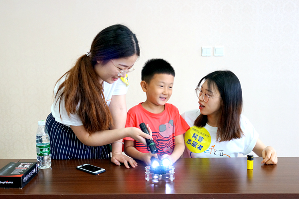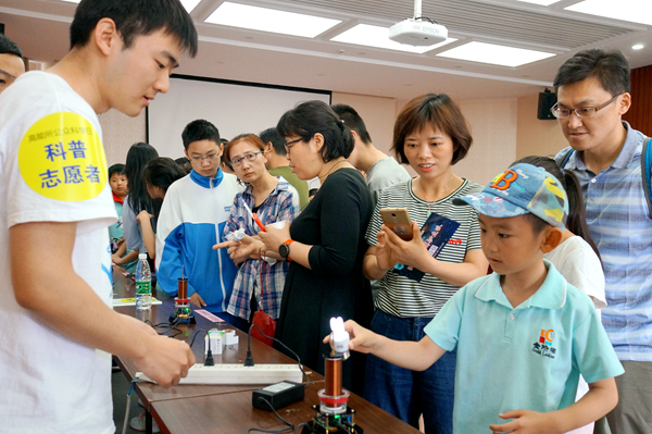 3个科技小实验引发了公众的极大兴趣。高能所老科协成员沈长铨老师通过讲解和演示“宇宙线扫描仪”,使公众形象地感受到宇宙线就在身边。学生志愿者演示了用特斯拉线圈点亮灯泡、用手电筒的光驱动磁悬浮电机的转子不停转动。