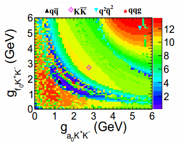 利用世界上最大的高统计量数据,BESⅢ实验首次观测到显著性超过5倍标准偏差的a0-f0混合信号,并对a0和f0与K介子对的耦合常数作出约束(如下图,颜色表示混合信号显著性)。a0-f0混合对a0和f0的内部结构非常敏感,为理解它们的性质提供了重要的实验依据。