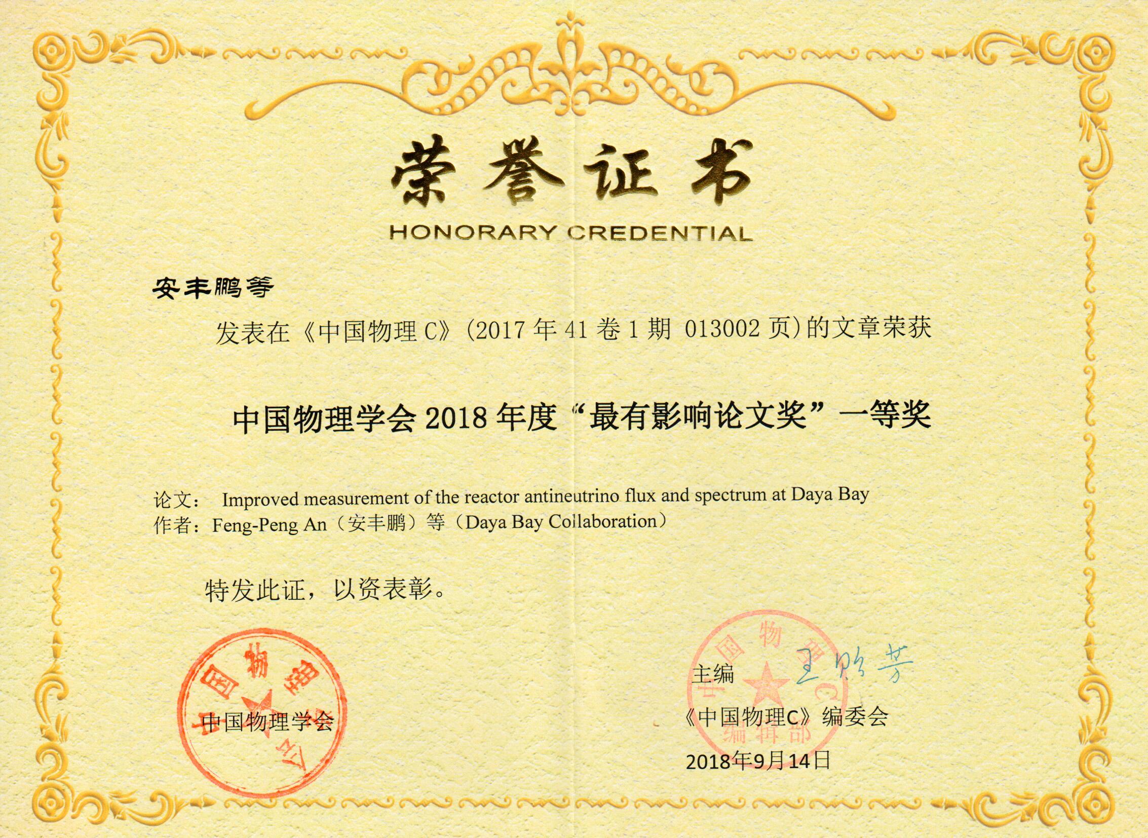 中国物理学会为鼓励国内外物理学科研工作者在学会主办的期刊上发表高质量论文,从2012年起设立“中国物理学会最有影响论文奖”,在每年召开的中国物理学会(CPS)秋季学术会议上予以颁布,并为获奖作者颁发荣誉证书和奖金。