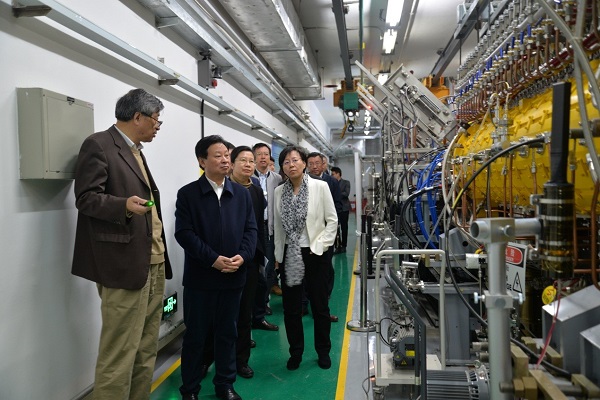 李树深首先观看了CSNS宣传片,在沙盘前听取了陈和生关于CSNS工程概况、原理和应用的介绍,并详细了解装置的建设和运行情况。在陈和生的陪同和讲解下,李树深一行来到CSNS装置现场,先后参观了直线加速器、环形加速器、环中控室和靶站谱仪大厅。