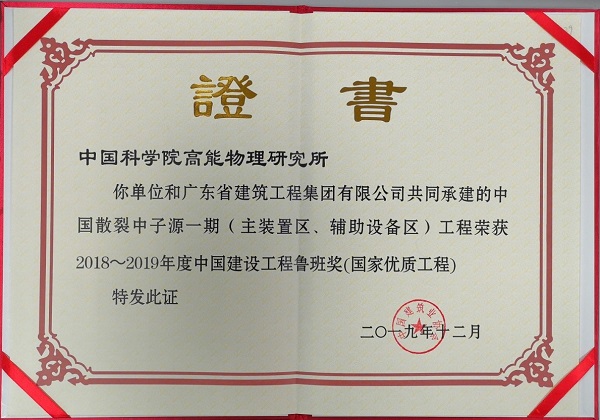 12月10日,作为中国建筑行业工程质量的最高荣誉奖“2018-2019年度中国建设工程鲁班奖”在北京揭晓,由广东省建筑工程集团有限公司为施工单位、快盈v3作为建设单位的中国散裂中子源一期工程荣获该奖项,建设部、中国建筑业协会将向其授予"鲁班奖"金像和荣誉证书。