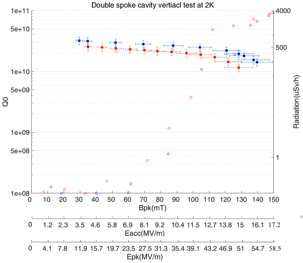 325 MHzSpoke超导腔在2K垂直测试下加速梯度Eacc达到14.8 MV/m,对应Q01.16×1010,且对应峰值磁场最高达129mT,这一成果已是目前国际上双Spoke超导腔性能的最高水平。本次垂测的结果显示,在中国散裂中子源二期项目当前的初步设计方案中,双Spoke腔的设计运行梯度为7.3MV/m,并且在该梯度下Q02.3×1010且无明显辐射剂量,完全满足散裂二期项目的需求。