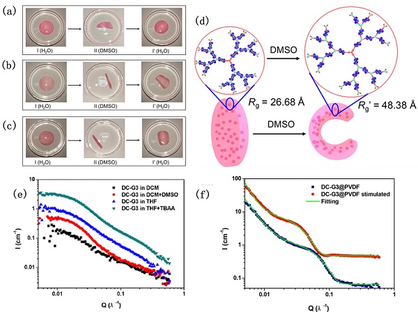 (a–c)第一代、第二代和第三代雏菊链树状分子复合膜的在刺激下快速和可逆的形变;(d)雏菊链树状分子复合膜可能的形变机理;(e)在不同溶液状态下,第三代雏菊链树状分子(DC-G3)刺激响应的SANS曲线,(f)溶剂调控雏菊链树状分子复合膜尺寸变化前后的SANS曲线。