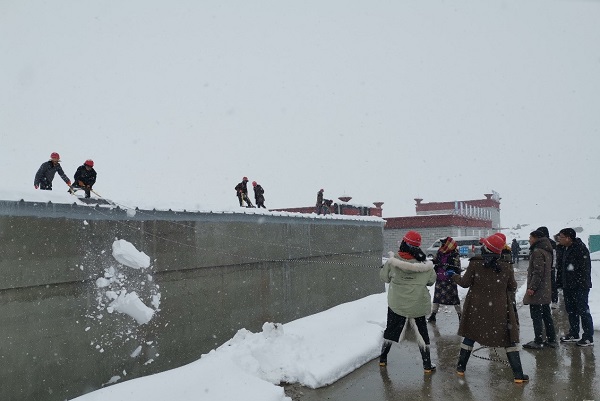 连日的暴风雪造成的屋面积雪已经严重超过了按照50年一遇的雪载设计极限,三个水池和装配大厅共8万平方米的轻钢屋顶面临极为严峻的结构性安全挑战。面对这一困境,工程经理部做出如下安排和决定:立刻禁止了三个水池和装配大厅内部的一切人员活动,中断探测器安装、维护工作,确保人员安全,并会同总包、设计、施工方、监理方,针对水切伦科夫探测器阵列的巨型水池和附属工程安全召开紧急会商,决定启动人工清除三个巨型水池和装配大厅屋面的积雪的紧急预案,确保结构安全。