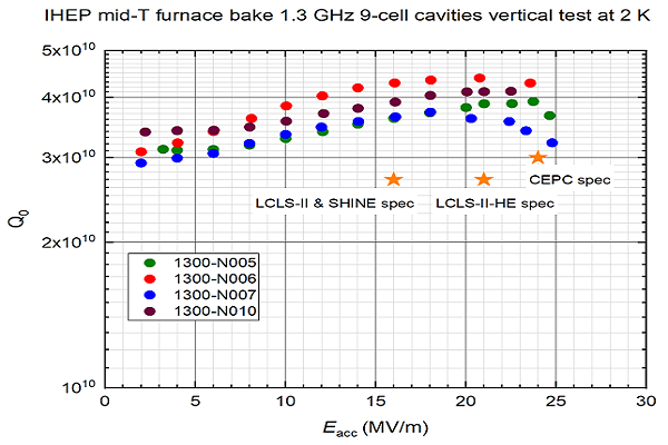 六只9-cell超导腔的性能均超过了上海硬X射线自由电子激光装置(SHINE)及美国直线相干光源二期项目(LCLS-II)的指标(2.7×1010@16 MV/m,加速梯度高于19 MV/m),也超过了美国直线相干光源二期能量升级项目(LCLS-II-HE)的指标(2.7×1010@21 MV/m),从公布的结果上看,Q值平均优于LCLS-II-HE掺氮超导腔。