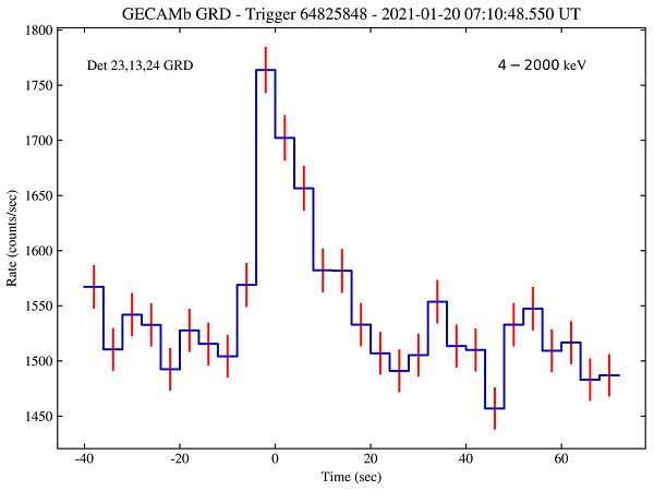 本次GECAM卫星发现的爆发天体是一个伽马射线暴(编号GRB 210120A),其发生于2021120日下午151048.550秒(北京时间),GECAM卫星通过星上在轨触发定位软件实时捕捉到该爆发事件,并将星上触发定位结果以及光变曲线等观测警报信息通过北斗三号系统下传至地面。GECAM卫星科学运行中心在触发后约60秒收到第一条北斗短报文,其后10分钟内收到所有短报文信息。短报文传输功能正常,性能指标均符合设计。