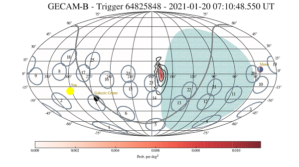 图2 伽马暴(GRB 210120A)定位图,根据北斗三号导航系统准实时下传的观测警报数据计算得到
