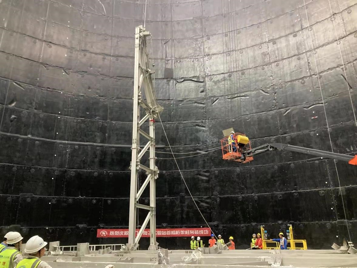江门中微子实验中心探测器的不锈钢网壳主结构第一榀支撑柱吊装现场