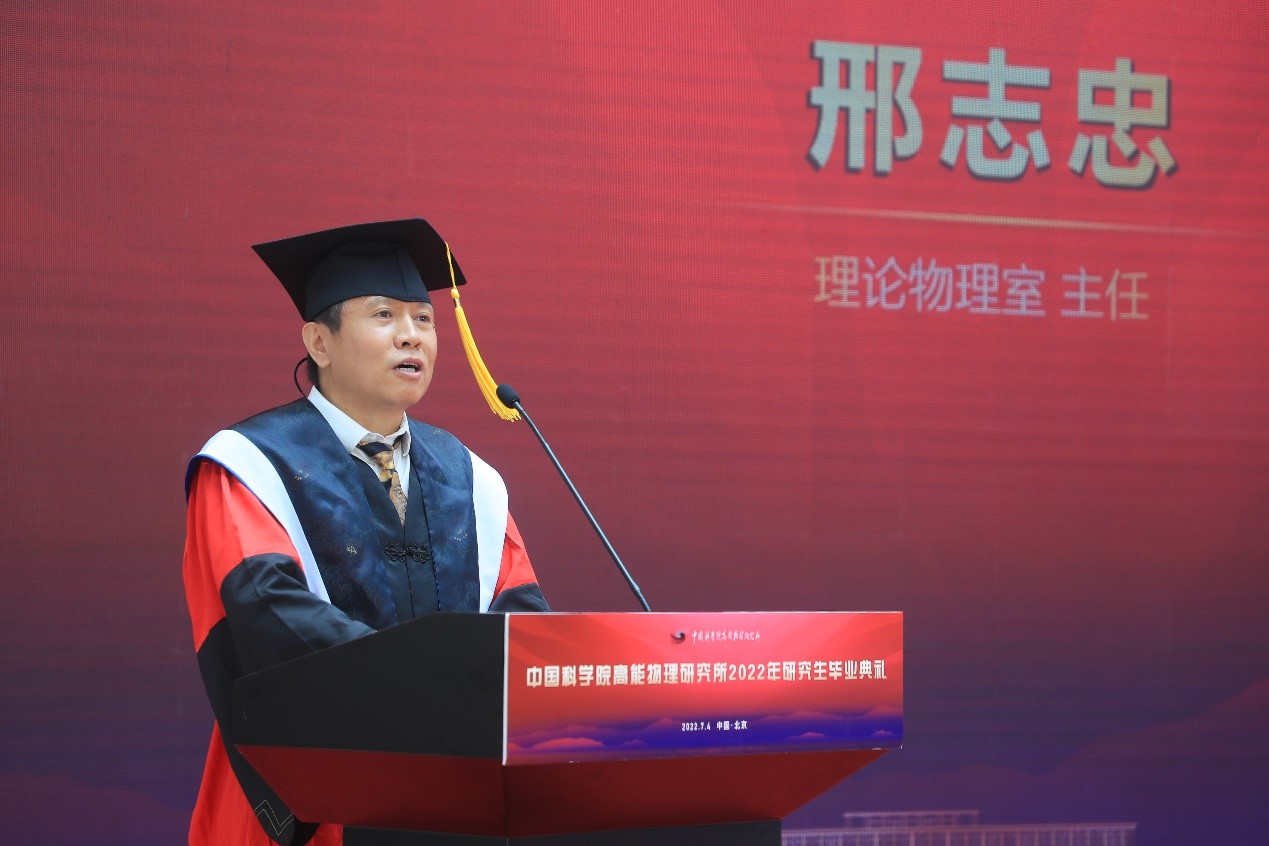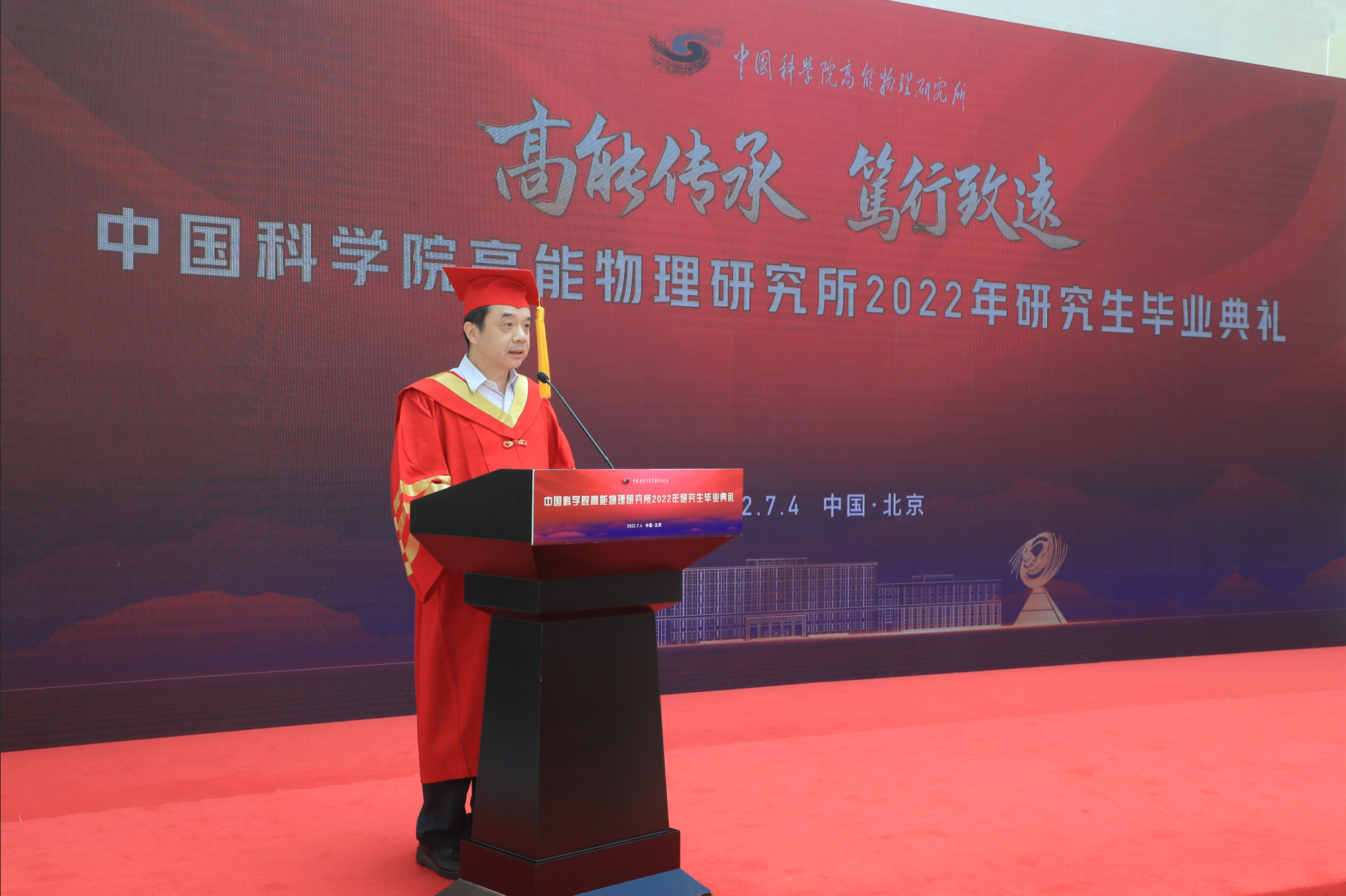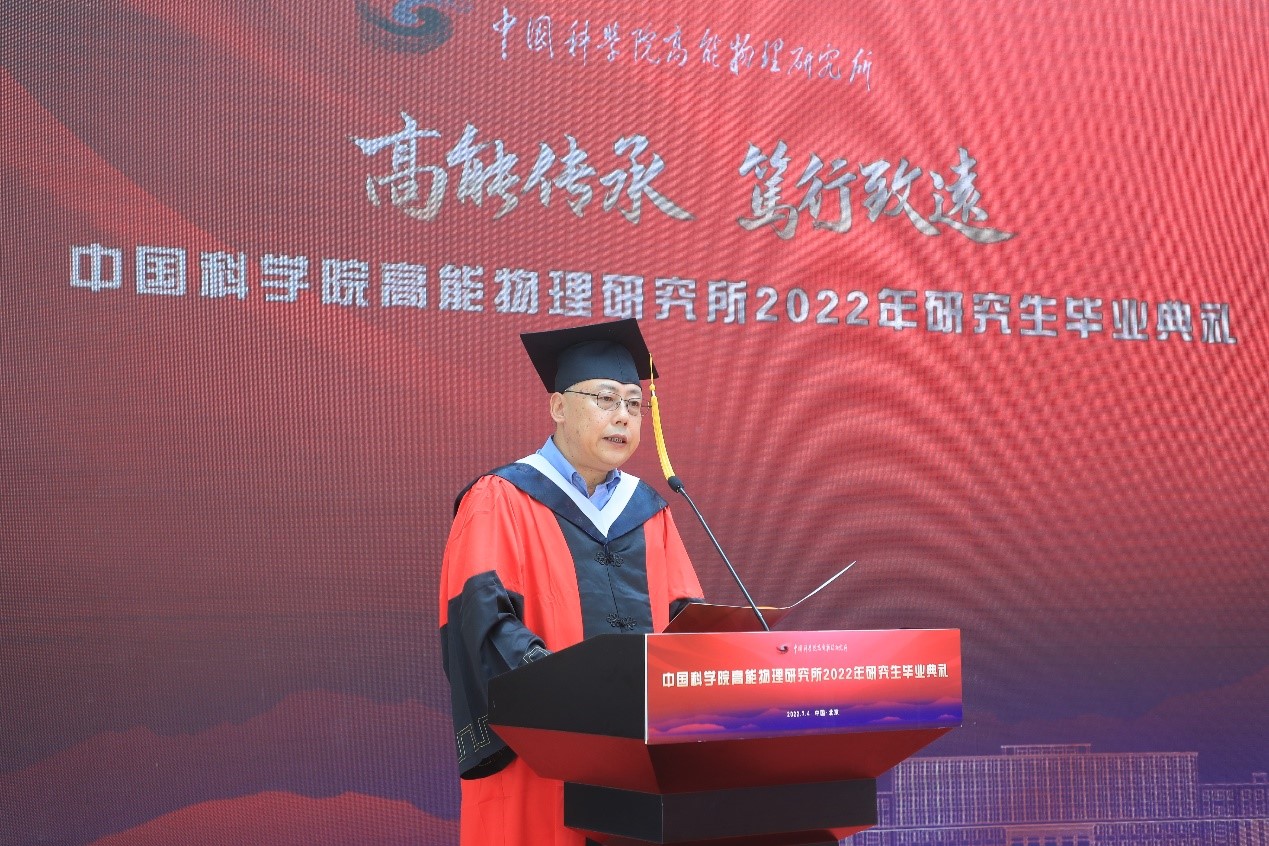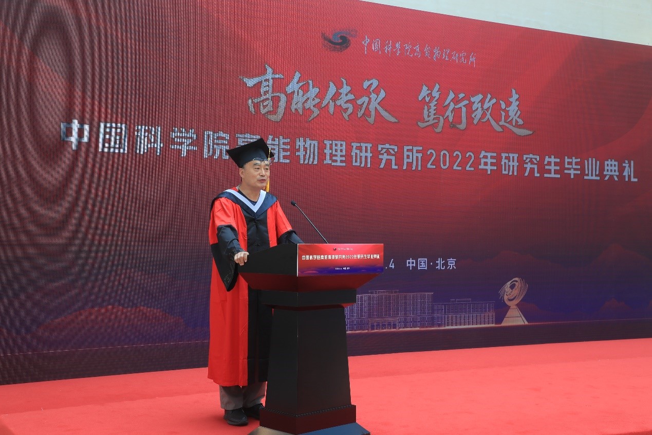 王贻芳向毕业的研究生表示祝贺,他说:“从江门地下700米的中微子实验装置,到海拔4410米的四川稻城海子山LHAASO;从遨游在太空的慧眼卫星,到怀柔科学城的高能同步辐射光源……高能所取得的各项科研成果背后都有各位同学的辛勤付出和坚持不懈。”他回忆这几年同学们与高能所共同经历的风雨,大家一起共克时代艰辛,齐心合力解决问题。他希望大家在未来的工作学习中坚持理想,不忘初心,并表示高能所的大门永远向大家敞开,随时欢迎同学们回来看看。