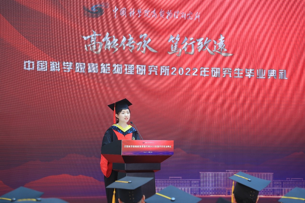 毕业生代表崔珊珊感谢高能所、导师及亲友对于大家的培养和支持,她分享了自己在高能所的点滴感悟与收获,并祝愿高能所在国家科技发展中再创佳绩,祝愿同学们展翅高飞、鹏程万里。