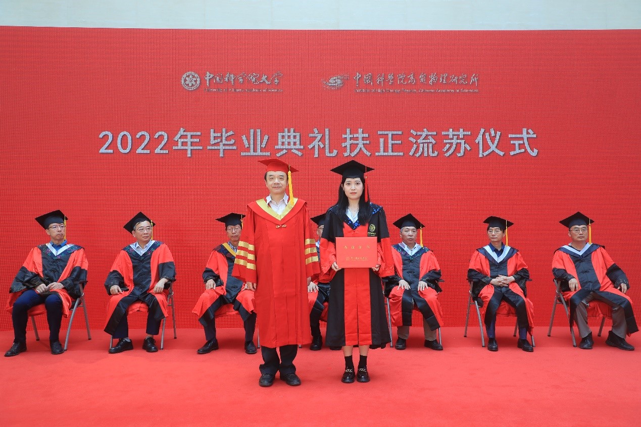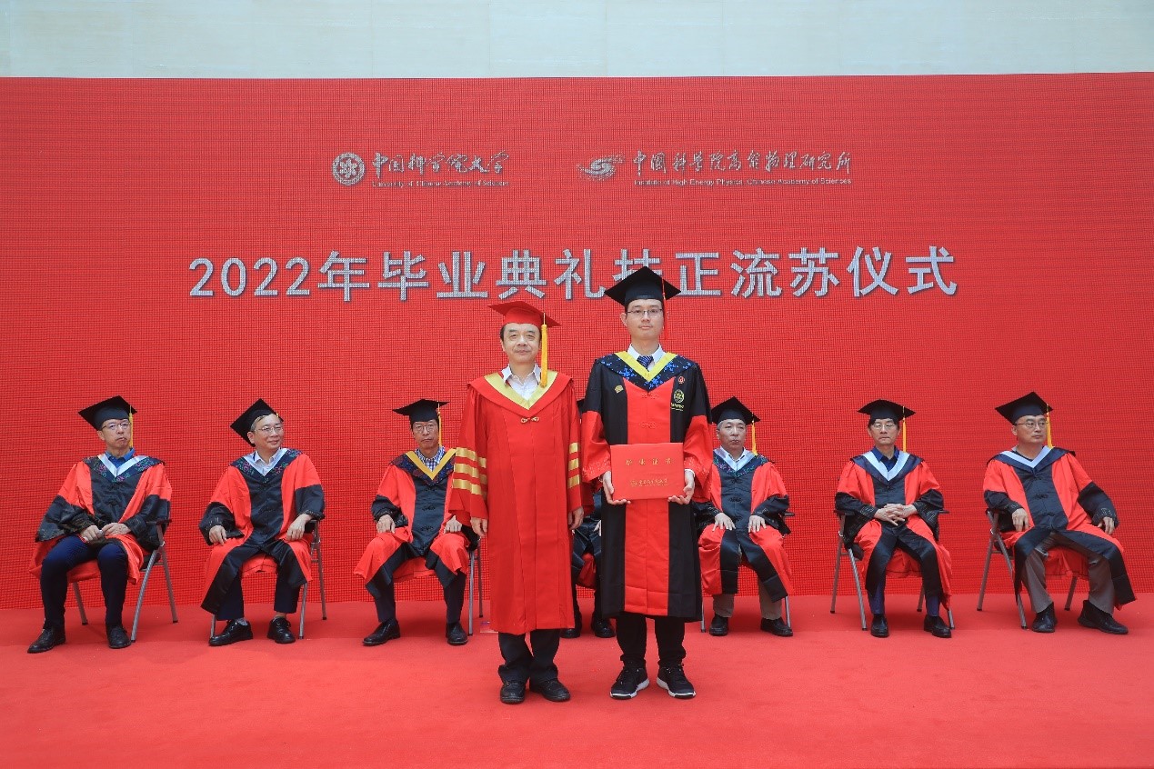 典礼上,王贻芳为院长奖获得者代表和优秀毕业生代表颁发荣誉证书,常哲为2022届校友联络人颁发聘书。随后,王贻芳为毕业生们颁发毕业证书,扶正流苏。魏龙希望毕业生们在“两个一百年”奋斗目标的历史交汇点上,要牢记党的教诲,立志民族复兴,不负韶华,不负时代,不负人民,在青春的赛道上奋力奔跑,争取跑出当代青年的最好成绩。