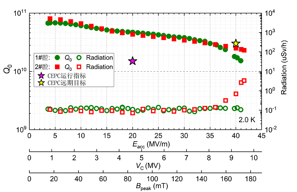 由于体积和表面积大、频率较低,国内大尺寸(频率小于1GHz)超导腔的加速梯度一直没有超过40MV/m,而国际上超过40MV/m的大尺寸超导腔也是屈指可数。因此,在高能所射频超导与低温研究中心的部署下,加速器中心高频组开展了CEPC高性能650 MHz single-cell超导腔的研发,希望可以达到CEPC的远期目标(3E10@40MV/m)。两只650 MHz single-cell超导腔的加速梯度均超过了40MV/m,这为下一步继续提高超导腔的Q值奠定了基础。