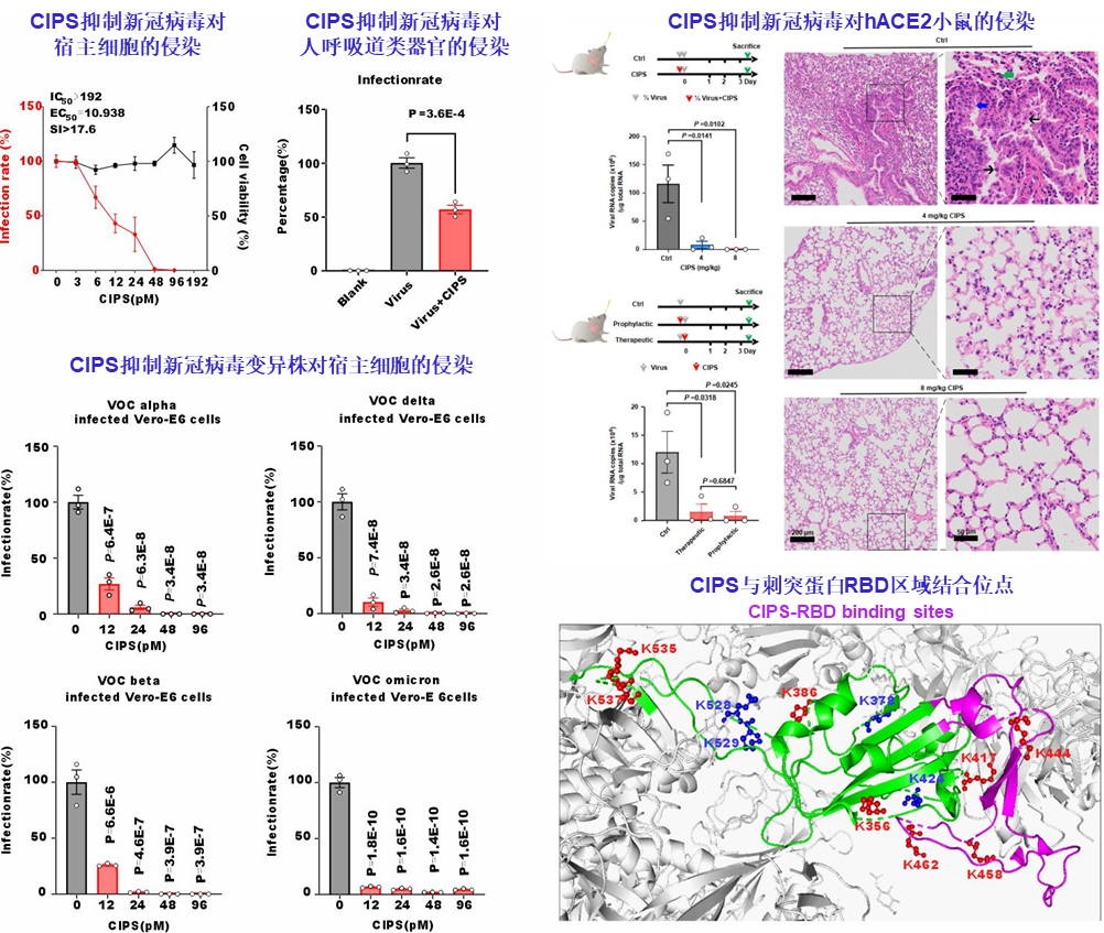 图1. CIPS能够有效抑制新冠病毒及其变异株对宿主细胞、人呼吸道类器官及小鼠肺部的侵染,缓解新冠病毒诱导的肺部炎症;CIPS通过占据刺突蛋白RBD区域与宿主ACE2受体的结合位点,实现抗病毒功能。来源:研究团队供图