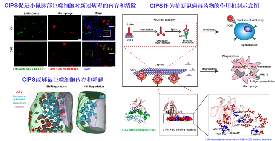 在细胞、类器官和小鼠动物模型上的实验表明,CIPS结合新冠病毒后,不仅能够高效地抑制病毒对宿主细胞的侵染,还可促进巨噬细胞对病毒的清除。巨噬细胞是机体免疫系统中发挥重要功能的效应细胞,能够高效清除外源入侵物。CIPS作为外源物质,在肺部能被巨噬细胞识别、捕获并降解。同时,CIPS作为一种可降解二维纳米材料,能够充当“胶水”或“陷阱”,特异性粘附新冠病毒表面的刺突蛋白,捕获并附着病毒颗粒形成病毒-CIPS复合物,引起巨噬细胞对病毒-CIPS复合物的摄取、降解和清除,诱发后续抗病毒免疫反应,提高抗病毒效率。