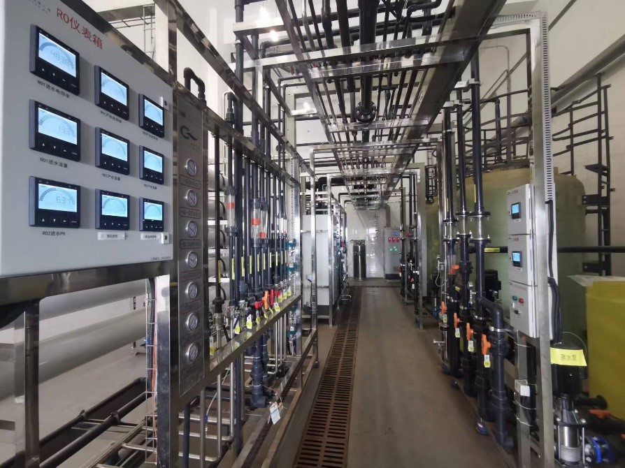 HEPS纯水站于2021年9月18日开始设备进场,今年7月初设备安装调试完成,主要指标均达到设计要求,并开始试运行。其中,纯水制备系统主要为工艺循环冷却水系统提供纯水补充水,同时可提供实验用去离子水。该系统产水量5m^3/h,采用预处理、两级反渗透、EDI、脱气膜、TOC消解器和末端抛光混床工艺,出水水质达到EW-1标准(其中出水电阻率达到18MΩ·cm(25℃)),DO含量小于10ppb。软化水系统主要为冷冻站提供软化水,系统产水量40T/hr,硬度(以碳酸钙计)≤80 mg/L。