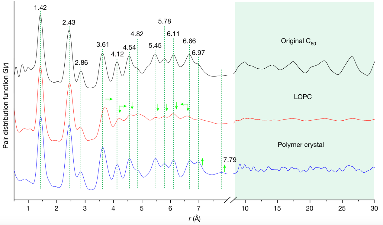 LOPC晶体是由C60分子之间通过共价键连接而成的新型人工碳晶体,既具有多孔特性又保留了C60分子晶体的长程有序特征。朱彦武教授团队与CSNS多物理谱仪合作,在CSNS多物理谱仪通过中子对分布函数技术(PDF)对系列样品进行了表征与研究,精确揭示了富勒烯C60分子晶体、LOPC晶体和聚合物晶体精细结构,为面心立方堆积的C60分子晶体转变为聚合物晶体和LOPC晶体过程中结构的演化提供了真实有力的关键证据之一(图1)。