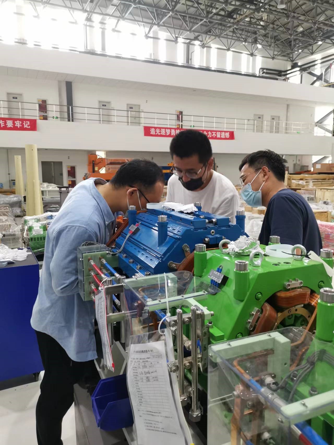 增强器全环真空系统长454米,真空接口800多个,空间紧凑狭小,安装工艺复杂。自2022年初非标设备逐步交付以来,项目组合理安排,认真做好真空设备验收、实验室预准直、隧道安装等,确保工程进度。过程中,项目组成员经历了北京新冠疫情最严重的时期,他们克服各种困难,督促厂家保质量,多人合作保进度。组内职工刘佳明,2021年驻厂半年多,2022年全年出差长达10个月,在安装过程中仔细认真,确保安装品质,手把手带新人,促进技术传承。