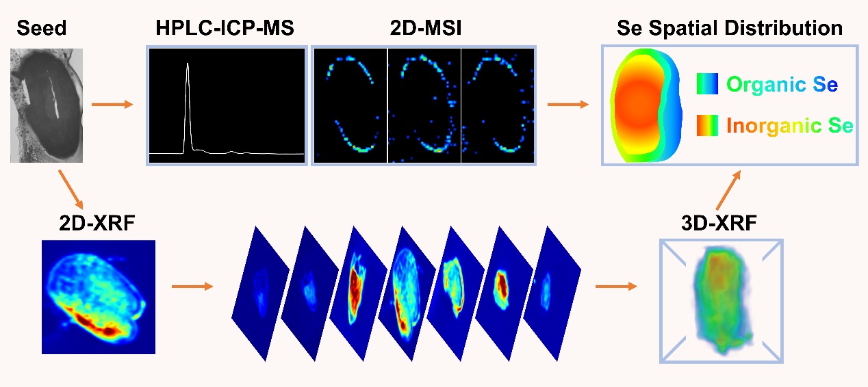 近日,中科院高能所李玉锋、周爱玉与东北大学于永亮等人合作,以硒超富集植物-堇叶碎米荠(Cardamine violifolia)单粒种子为研究对象,借助北京同步辐射装置X射线荧光微分析实验站硬件和软件功能升级契机,发展了基于同步辐射X射线荧光二维/三维成像技术、同步辐射X射线吸收谱技术、二维质谱成像技术及微区计算机断层扫描(micro-CT)技术的空间金属组学(spatial metallomics)研究框架,实现了堇叶碎米荠单粒种子中有机硒和无机硒的原位二维/三维成像(图1),首次发现堇叶碎米荠种皮中存在甲基硒代化合物,加深了对堇叶碎米荠富硒机制的理解,并以Spatial metallomics reveals preferable accumulation of methylated selenium in a single seed of the hyperaccumulator Cardamine violifolia为题发表于 Journal of Agricultural and Food Chemistry。值得一提的是,这是北京同步辐射装置X射线荧光实验站首次利用飞扫技术结合连续切片技术实现样品中元素三维成像(图2)。