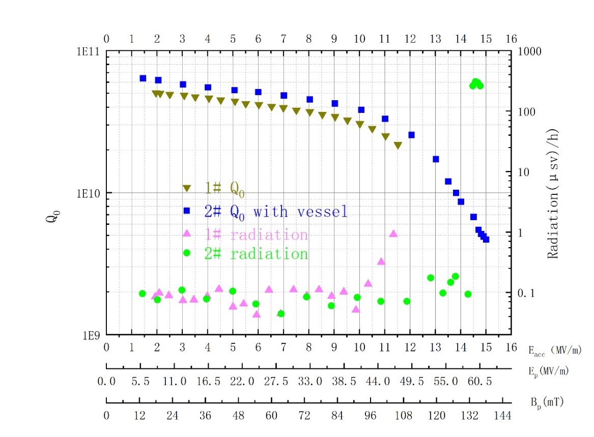经过2K垂直测试,1#腔最大梯度达到11.6MV/m,对应 Q0=2.18E10。2#腔在1#腔基础上对焊接工艺进行优化,其带氦槽测试最大梯度达到15 MV/m,峰值磁场达到138mT,峰值电场达到61.5MV/m,在设计运行梯度7.3MV/m时,Q0=4.6E10,在14MV/m以下无明显剂量。