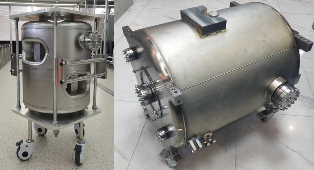 双spoke超导腔裸腔(左)和带氦槽双spoke超导腔(右)