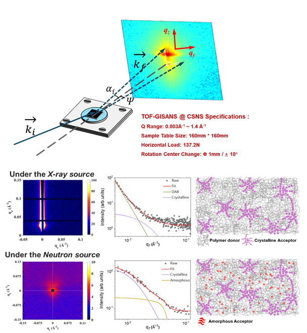 合作团队近期利用TOF-GISANS技术在有机光伏(OPV)异质结薄膜中首次发现了一种新的纳米畴结构。相关研究以“Deuteration-enhanced neutron contrasts to probe amorphous domain sizes in organic photovoltaic bulk heterojunction films”为题在线发表在Nature子刊《Nature Communication》。OPV异质结由有机给体(D)和受体(A)混合物组成,给体和受体结构域的大小严重影响OPV器件的性能,但因衬度差别小,采用X射线散射无法对D/A混合区中不同的结构域(结晶和非晶畴)进行检测区分。在该研究中,通过靶向氘化将PM6/Y6有机光伏体异质结中D/A中子散射衬度提高近一个数量级,从而首次揭示了PM6/氘化Y6(d-Y6)OPV薄膜中一种新的非晶纳米结构域(如图1)。研究结果表明d-Y6分子在无定形混合区域中存在短程聚集,该聚集可促进电荷提取并抑制电荷复合,这为有机光伏器件的结构设计和性能调控提供了至关重要的理论指导和实验证据。