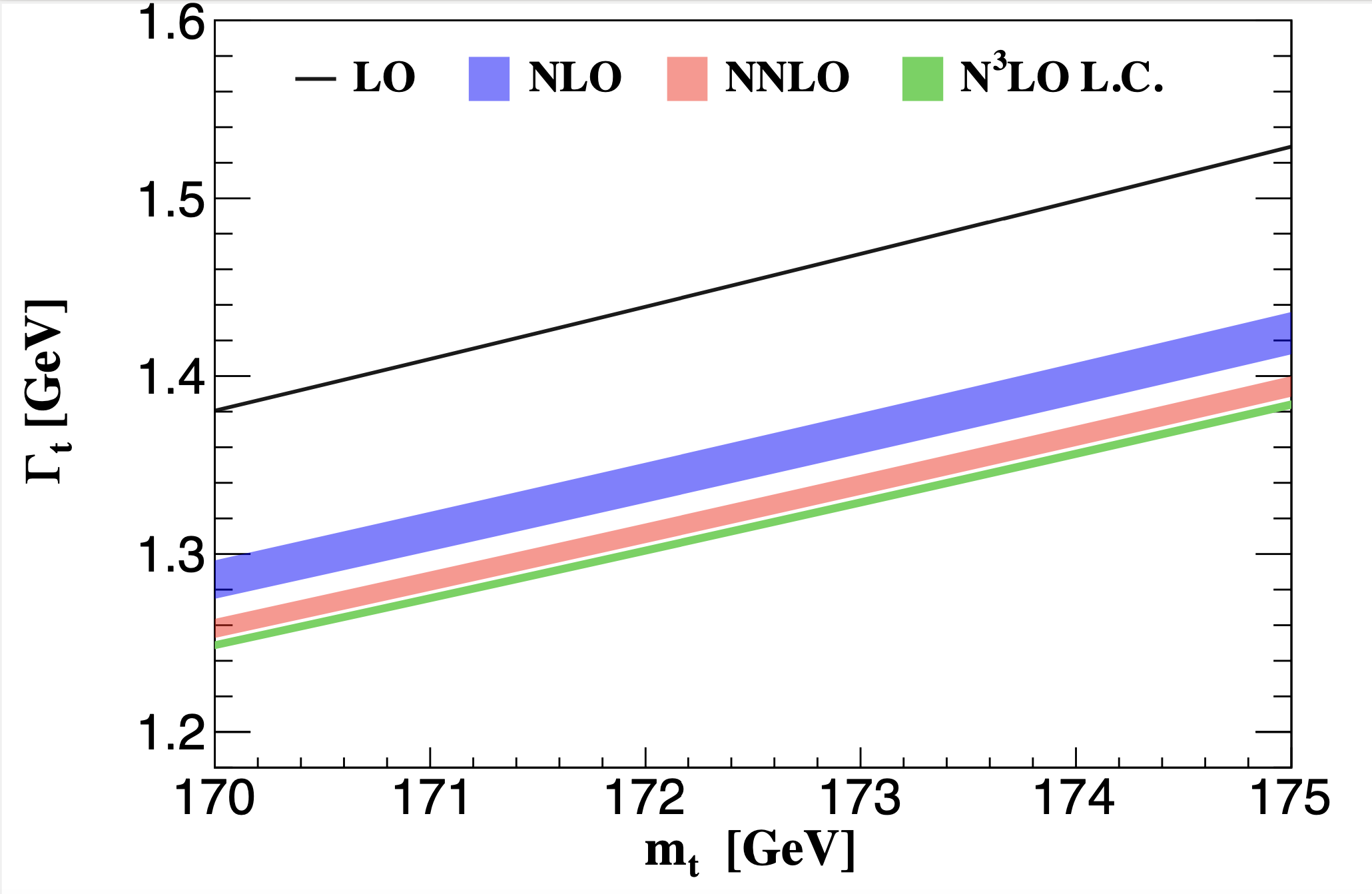 在这项研究中,研究团队首先运用光学定理将衰变宽度与顶夸克自能图的虚部建立了联系,随后利用现代方法处理费曼积分,将积分问题转化为解微分方程的问题,并将结果以调和多对数函数的形式表达出来,这是一种对数函数多重积分的推广。同时还公开发布了一种程序包,以便于科研人员能够快速且准确地进行计算。在顶夸克质量设定为172.69 GeV的情况下,他们得到了顶夸克衰变宽度的理论预言值,精确到1.321 GeV。对于其他顶夸克质量,理论预言结果如下图所示: