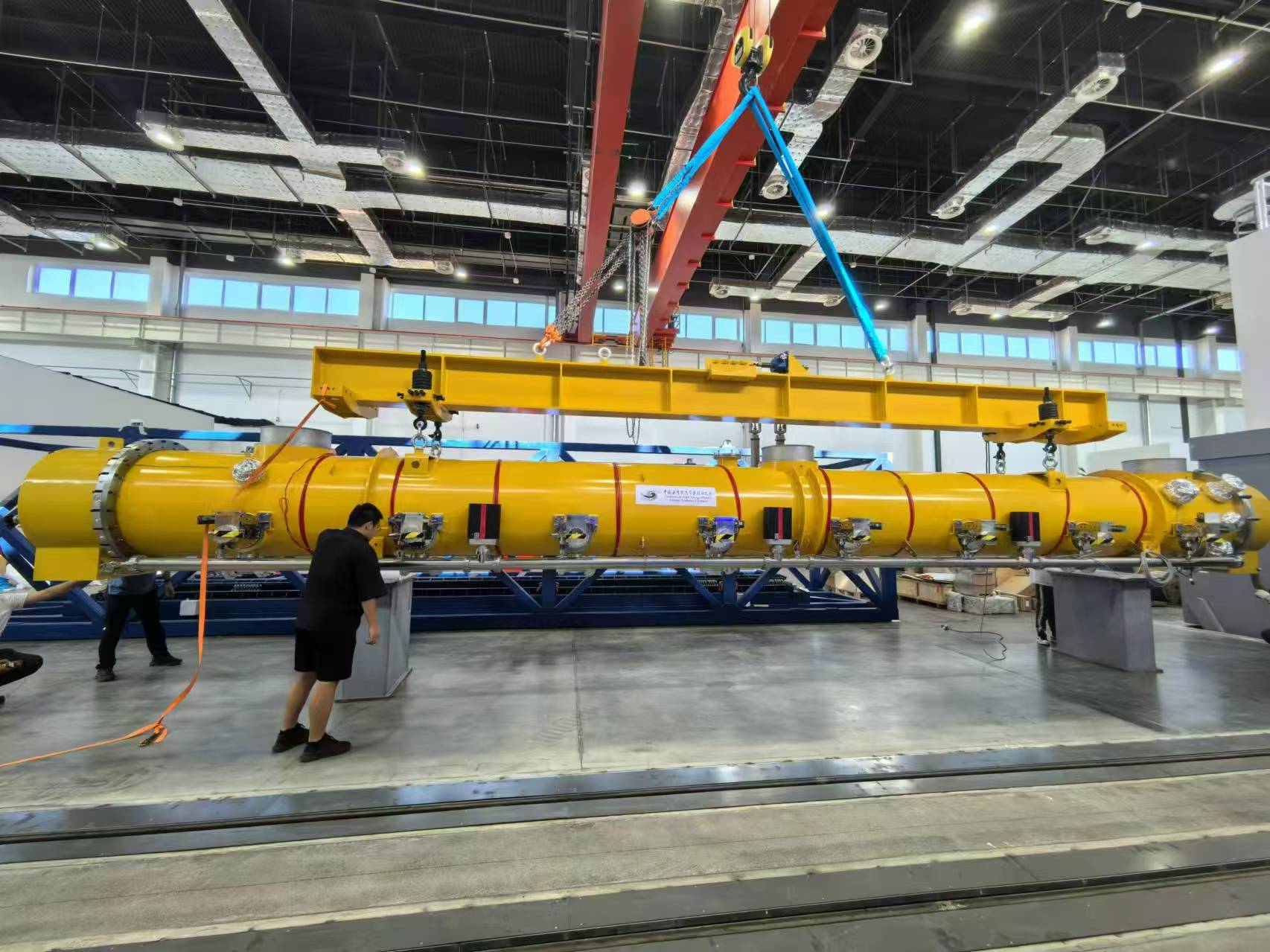 1.3 GHz 9-cell超导加速模组总长度12米,由8只1.3 GHz 9-cell超导腔在一个恒温器筒体内串联组成,在国内是首次成功完成远距离运输,前期已经过多次样机运输试验,同样涉及到复杂的吊装工艺和保护等准备。