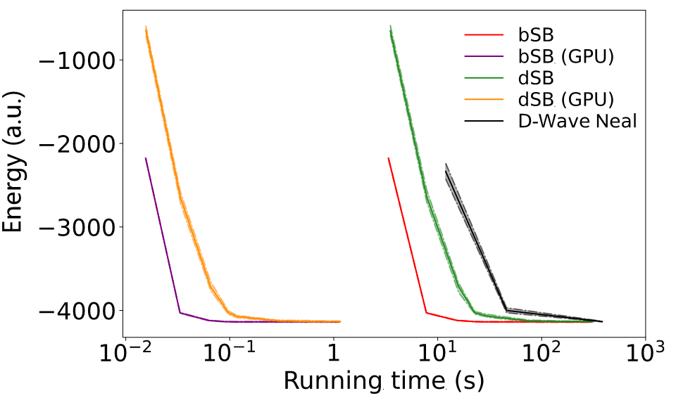 2:针对三种量子退火启发算法评估的最高粒子多重性事例(9435个粒子,转化为伊辛问题后的自旋数目为109,498)中伊辛能量的演化。实线表示50个执行的平均值,而包络线表示这些执行中的最佳和最差情况。