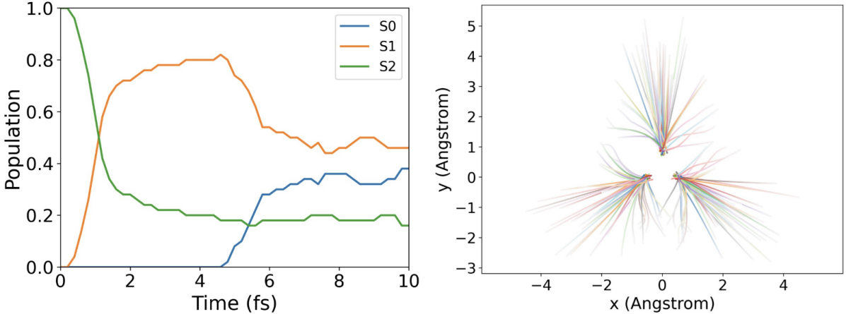 针对上述挑战,研究团队提出了一种量子计算适配的扩展Landau–Zener面跳跃(LZSH)非绝热分子动力学框架。通过引入曲率保护的跳跃修正,在避免计算非绝热耦合(NAC)的情况下,保持了电子态布居数演化的物理一致性,从而能够有效地描述电子态的跃迁过程。此外,为满足LZSH动力学对高精度势能面的需求,该工作开发了一种高精度(误差在1*10-6 Hartree量级)的势能面计算方案。该方案支持活性空间选择,可在量子或经典计算集群上实现并行加速,并展示了对多种化学体系(如H3+离子、乙烯分子等)的良好适应性。