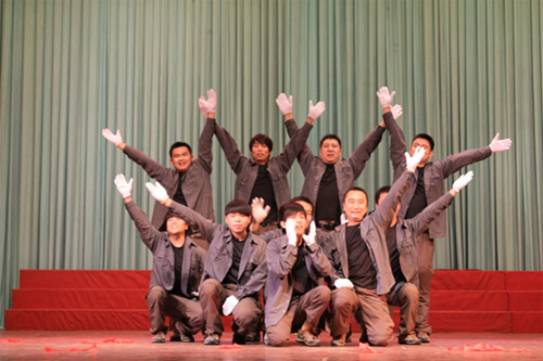 经过一个多月的紧张排练,终于迎来了29日汇报演出。台上十名青年职工,穿着登山裤、黑T恤、绿衬衫,戴着白手套,整齐的站成两排。广播体操的音乐响起,预想到的动作没有做,却是拿着两个红绸带伴着纤夫的爱跳大秧歌。台上职工夸张滑稽的表演、不可预料的舞蹈,迎来了台下观众的一片笑声和阵阵的鼓掌。一会儿是千手观音,一会儿是英雄射大雕,每个动作随着音乐不断的变换,全场热闹气氛达到顶点。