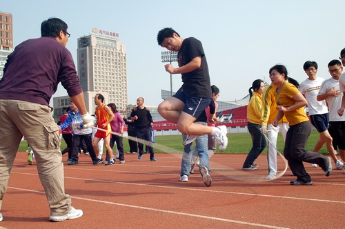 随着院领导宣布“运动会开始——”,安静的运动场一下子热闹起来。彩旗飘飘,迎风招展,操场上亭亭玉立的广播操运动员在节奏欢快活泼的音乐的伴奏下,一行行,一列列,比谁的广播操动作最标准,比哪个中心的队伍最整齐划一。在开场的广播操表演后,田赛、径赛场地的项目虽同时进行,却在工会的组织下秩序井然,有条不紊。赶猪和托球跑比赛,妙处横生,欢乐多多;短跑紧张激烈,而长跑比赛是耐力和速度的综合体现;踢毽子比赛,单人的考验稳定性,双人的突出配合协调性;接力比赛最激动人心,加速器中心的四员女将,巾帼不让须眉,齐心协力,奋勇作战,遥遥领先同组第二名几十米;最后进行的跳绳集体项目,呼呼的摇绳声伴随着观众的呐喊声,连续跑动钻跳的身影为我们展现的是协同一致与巧妙配合的集体风貌。