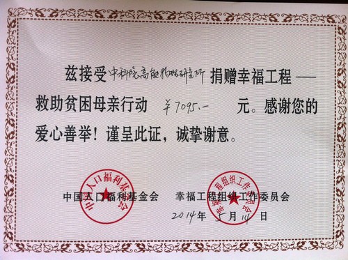 2014年是中央国家机关人口和计划生育委员会组织开展“幸福工程——救助贫困母亲行动”的第17年。多年来,幸福工程把爱心者的奉献与弱势群体的需求有机地结合在一起,共同营造了幸福与和谐的社会氛围。高能所干部职工在2014年5月 “向实行计划生育的贫困母亲献爱心”的捐款活动中共计捐款7095元,全所共有194人在19个部门的计划生育宣传员的组织下积极参加了此次活动,为救助贫困母亲、扶助计划生育困难家庭做出贡献。5月14日,所计生办已将募捐款项交到中科院人口和计划生育委员会办公室。