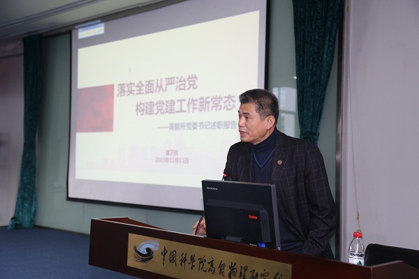 党委书记潘卫民作了题为“落实全面从严治党,构建党建工作新常态”的述职报告。报告从落实规章制度、履行“主体责任”、全面从严治党和“三严三实”专题教育等六个方面进行了详细的述职汇报,对落实全面从严治党、以解决问题为最终目标、切实做好“三严三实”专题教育等任务进行了重点梳理总结。报告指出不足之处,明确改进措施并制定出切实可行的未来规划,力争在党中央全面从严治党的形势下,不断提升自身党建工作水平,不断提高服务科技创新的能力和水平。