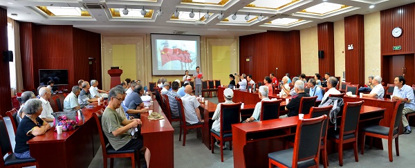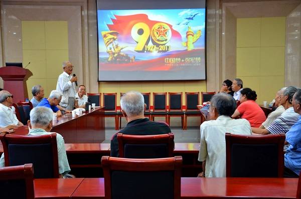 本次活动是总支为纪念建军九十周年面向高能所离退休复转老军人专门举办,其中有9位是80岁以上的高龄老人。座谈会开始前,全体到会的复转军人集合起立,面向军旗庄重敬礼、高唱中国人民解放军军歌,在嘹亮的军歌声中,老兵们仿佛又回到了当年那段激情燃烧的岁月。