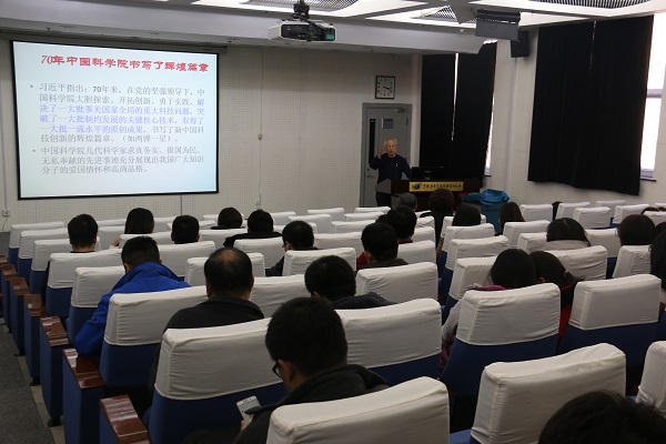 会上,高能所原党委书记、理论室研究员,现高能所老科协理事长姜焕清作了题为《学习老一辈科学家的爱国情怀和求真务实无私奉献的精神》的主题报告。报告中,他以亲历者的角度讲述了高能所的历史沿革,指出高能物理所的成长和发展历程是新中国核科技事业和高能物理事业沧桑巨变的缩影,是中华民族当代科学精英科技报国的生动写照;他通过具体的人物事迹生动阐述了高能所老一辈科学家的爱国情怀和求真务实无私奉献的精神。他在报告中指出:今天的情况与70年前,甚至40年前相比,都是太好了,作为年轻一代,你们要传承老一辈科学家的高尚品格,为发展我国的科学事业,为实现中华民主的伟大复兴而努力奋斗。