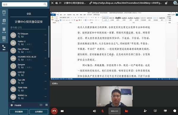 为响应中科院和高能所党委号召,激发党组织和党员在疫情防控工作中的积极性,2月5日下午,计算中心党支部以在线视频会议的形式举行了“疫情防控”主题党日学习活动。此次学习利用新媒体视频会议形式开展,会议由支部书记程耀东主持,党员、发展对象和积极分子共计23人参加。