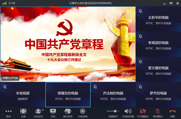 为了积极响应中科院和所党委号召,6月19日,中科院高能所计算中心党支部以在线视频会议的形式举行了“基层组织建设年”主题党日学习暨优秀党员评选活动。会议由支部书记程耀东主持,三个党小组及青年理论学习小组成员共计25人参加。
