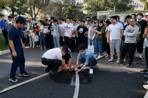 在消防安全演练环节,有序、精练的讲解和实地操作,以及灭火器的练习使用、灭火水枪的实际操作等,让与会职工、学生体验和掌握了正确使用工具灭火的方法。