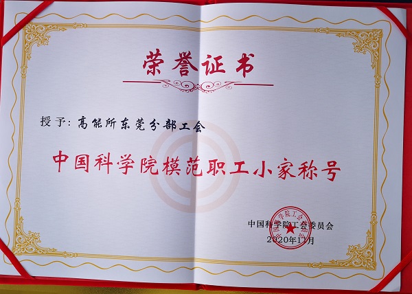 近日,中国科学院工会委员会印发了《关于表彰中国科学院模范职工之家、模范职工小家、优秀工会工作者、优秀工会积极分子、优秀工会之友的决定》,中科院高能所东莞研究部工会荣获“模范职工小家”、原工会主席陈宏刚荣获“优秀工会工作者”、原工会副主席苏萍荣获“优秀工会积极分子”的荣誉称号。
