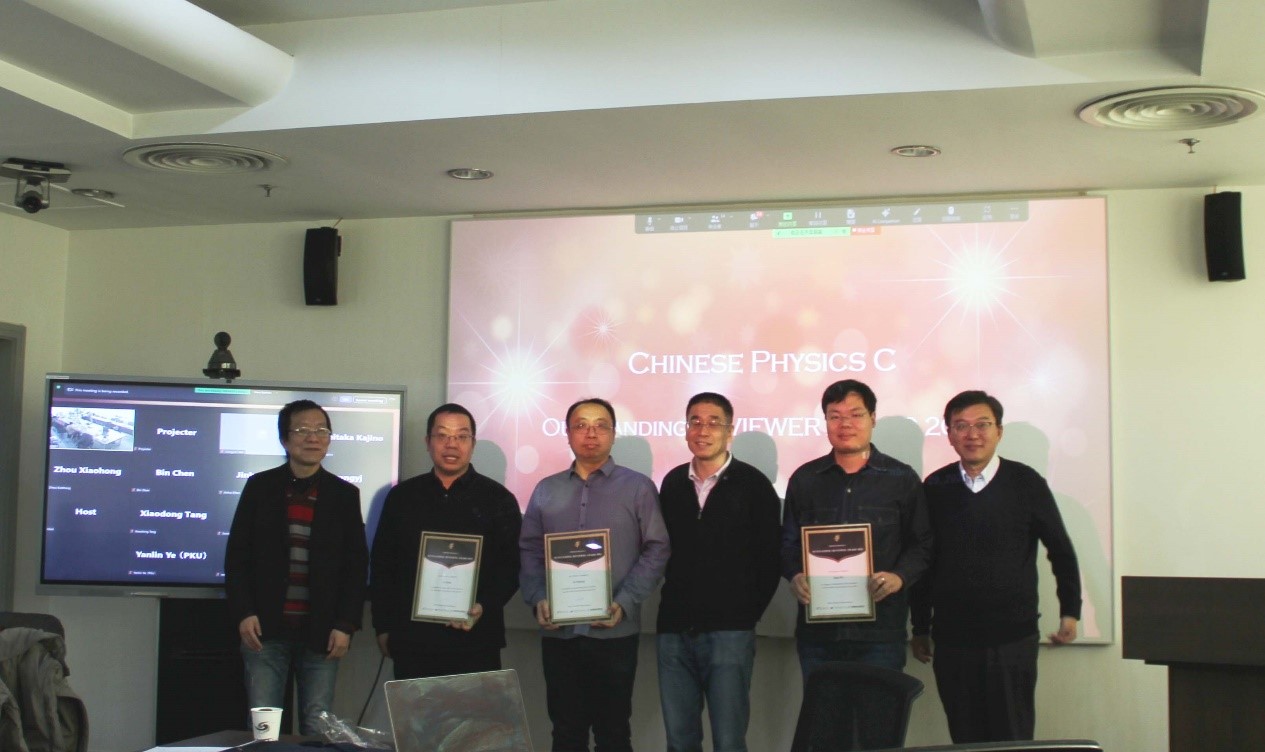 根据会议议程,吕才典、李海波、左维向2023年度优秀审稿人代表蒋伟(高能物理所)、李强(北京大学)、安海鹏(清华大学)颁发了获奖证书,感谢他们为《中国物理C》审稿工作做出的贡献。