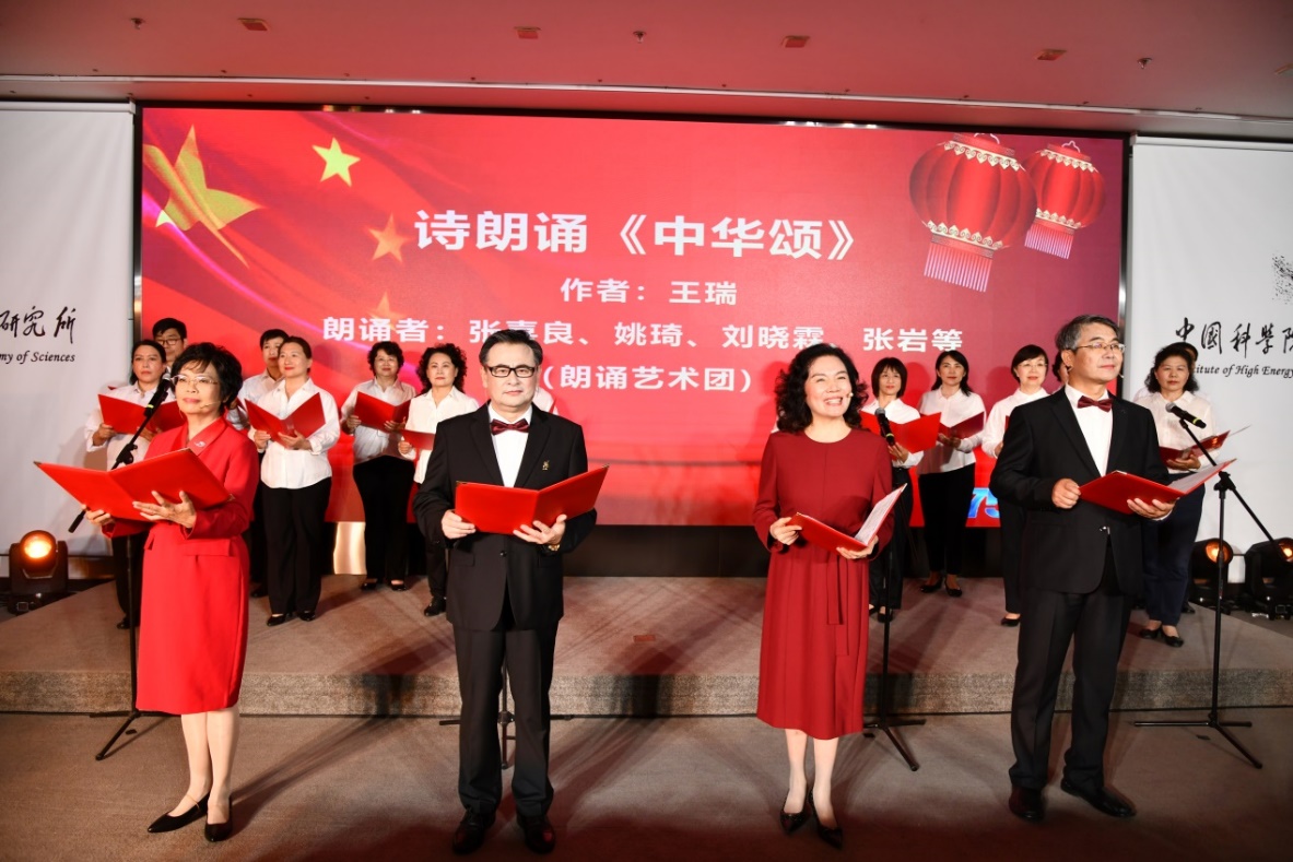 此次朗诵音乐会涵盖了诗歌朗诵、独唱、舞蹈、话剧等多种节目形式,由院文联朗诵艺术团、科苑艺术团和高能物理所部分文艺骨干共同呈现,节目内容有讴歌伟大新时代的诗朗诵《中华颂》《复兴颂》、女声独唱《节日欢歌》《我和我的祖国》、舞蹈《一条大河》等,有献给中国科学院成立75周年的诗朗诵《由“1”出发——写给中国科学院75岁生日》,还有与高能物理所科技事业有关诗朗诵《对撞机赞歌》《献给敬爱的谢家麟院士》、女声独唱《星辰大海》(歌词以高能物理所为歌颂对象重新填词)等,尤其是朗诵艺术团带来的微型话剧《在那遥远的地方》,真实展现两位年轻人将青春岁月奉献给“两弹一星”事业的感人故事,作品深深感染了在场观众。最后,朗诵音乐会在全场齐唱《我的祖国》声中成功落下帷幕。