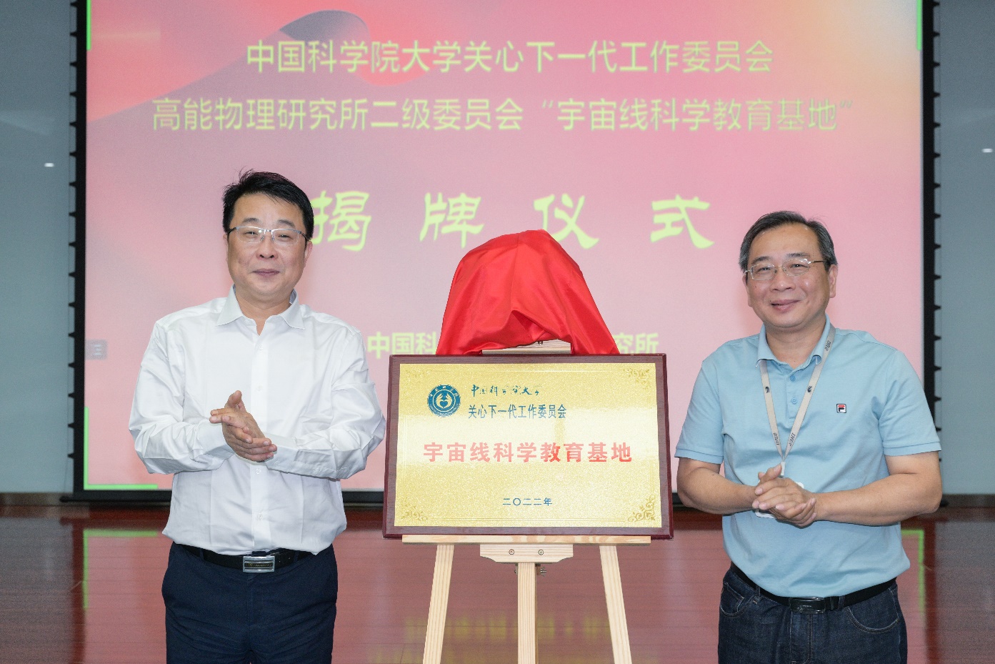 董纪昌副校长、董宇辉副所长共同为“宇宙线科学教育基地”揭牌,全场响起热烈的掌声,庆祝中国科学院大学关心下一代工作委员会高能物理研究所二级委员会“宇宙线科学教育基地”的落成。