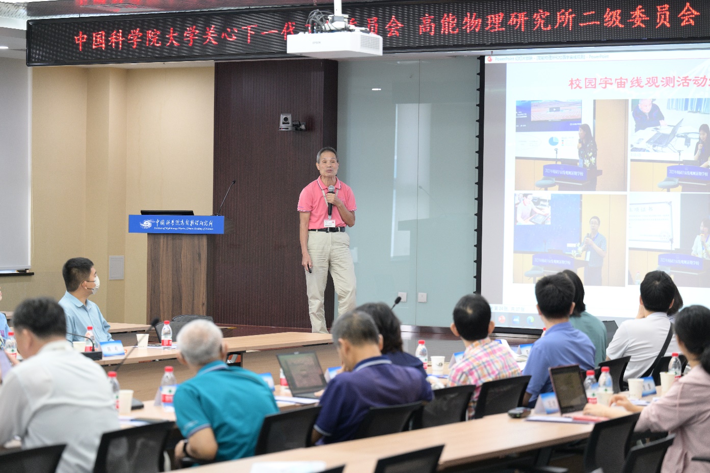 首先,董纪昌致辞。他感谢高能所对国科大各项工作的支持,指出以老同志为主的关工委所做的工作响应了国家战略,在关心青少年成长、全民科学素养提升等方面做了很多工作,他表示会持续支持关工委和“宇宙线科学教育基地”的发展。