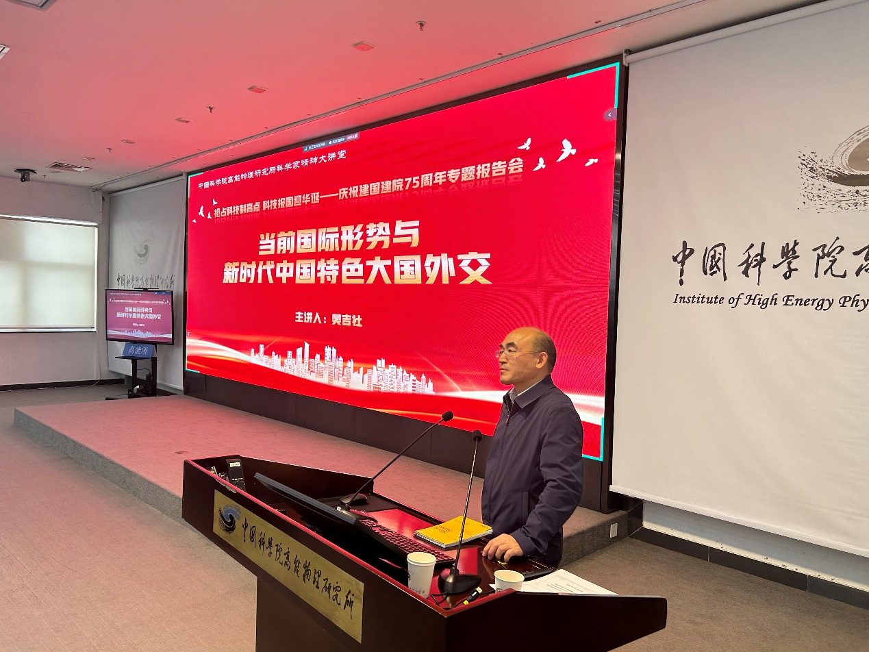 为庆祝新中国成立75周年、中国科学院建院75周年,纪念我国第一颗原子弹爆炸成功60周年,10月9日,高能所举办了 “抢占科技制高点 科技报国迎华诞” 专题报告会暨科学家精神大讲堂活动。中央党校(国家行政学院)国际战略研究院副院长樊吉社教授以《当前国际形势与新时代中国特色大国外交》为题作专题报告。专题报告会活动由高能所纪委书记李伟主持。